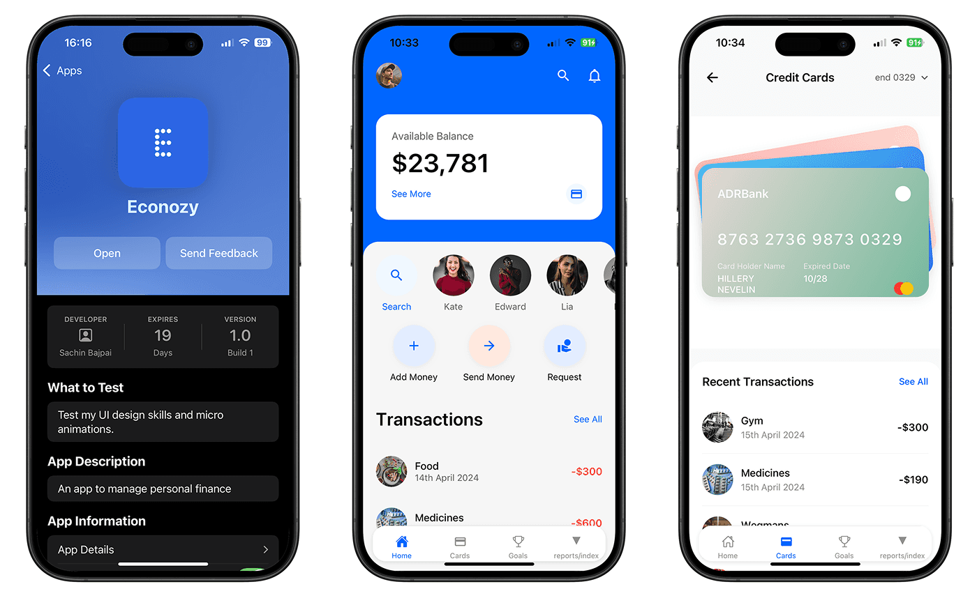 Econozy is a personal finance app that helps understand spending and stay on track with financial goals through expense insights, goal tracking, and simple transfers. I led end-to-end design and built the working MVP, from research and wireframes to high-fidelity UI.