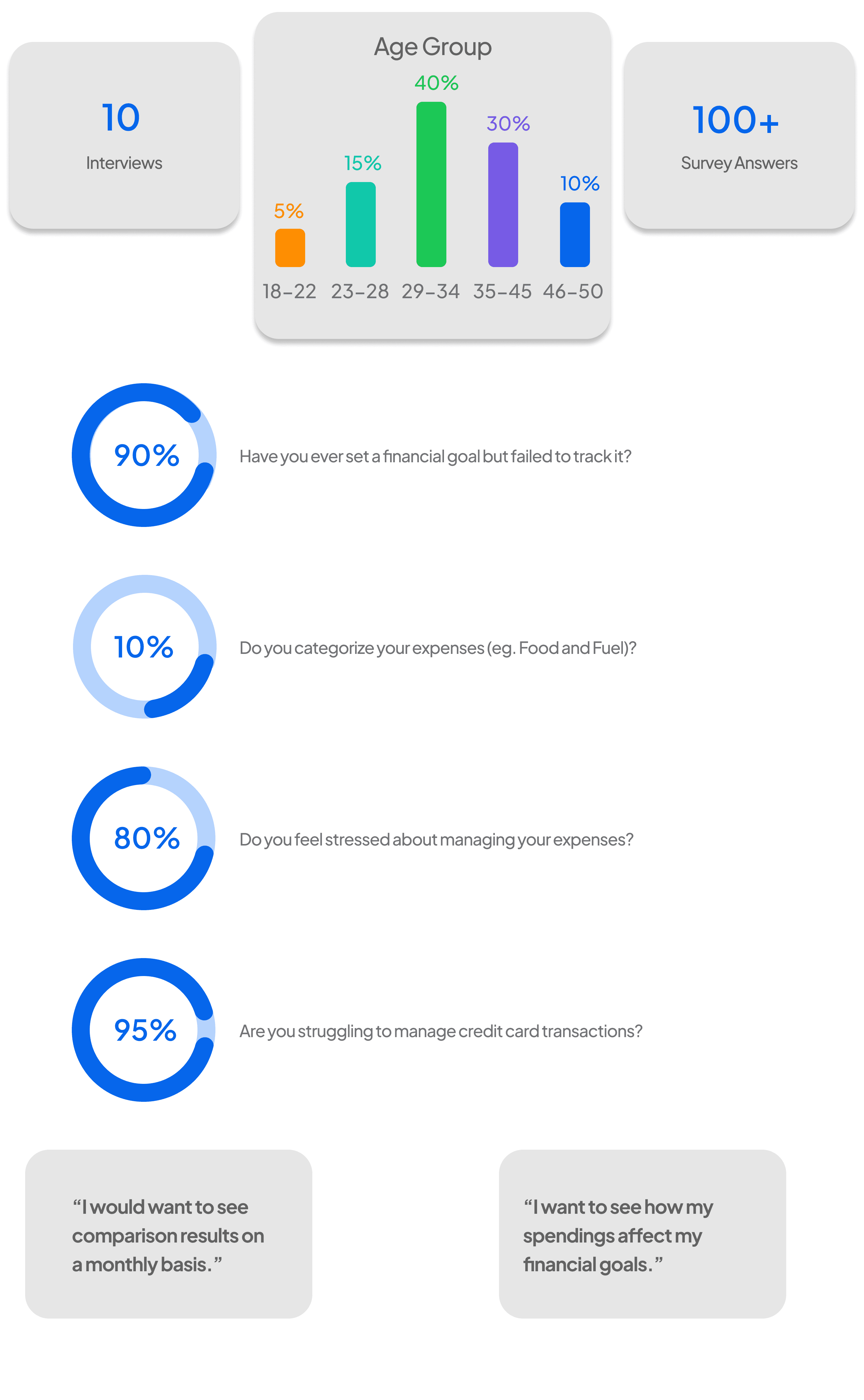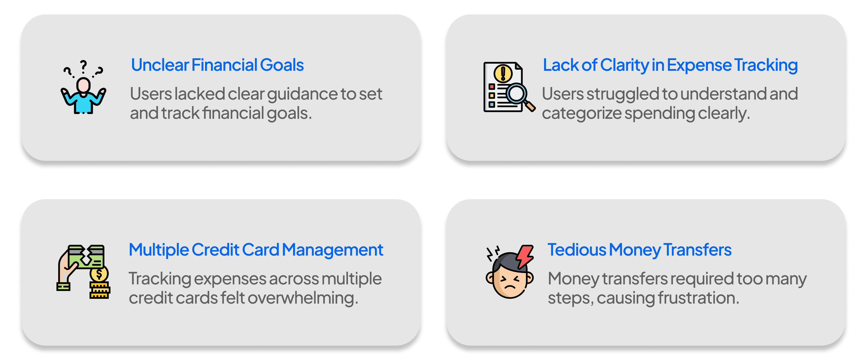 Users struggle to stay motivated and track financial goals due to scattered expense data, and research revealed four key personal finance pain points.